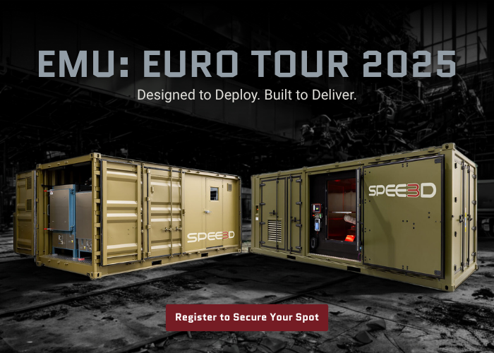 SPEE3D’s Expeditionary Manufacturing Unit (EMU) is hitting the road, travelling across several locations in Europe to manufacture metal parts live. During these demonstrations, the XSPEE3D cold spray metal 3D printer will produce critical replacements for land and marine vehicles in aluminium 6061, and these parts will be heat treated, machined, and tested in the adjacent SPEE3Dcell – all on site!
